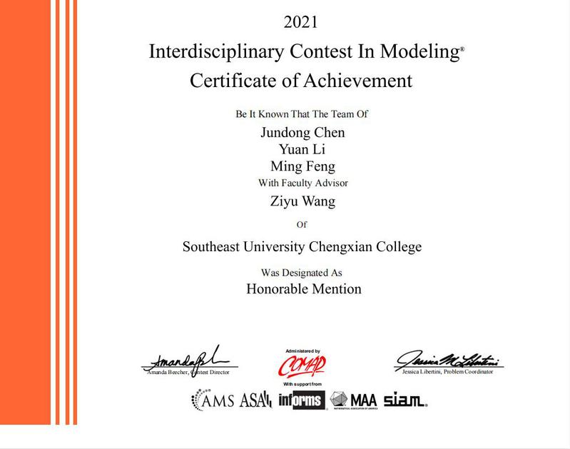 美国大学生数学建模竞赛(MCM/ICM)由美国数学及其应用联合会主办,是唯一的国际性数学建模竞赛,也是世界范围内最具影响力的数学建模竞赛。赛题内容涉经济、管理、环境、资源、生态、医学、安全等众多领域。该比赛奖项共分五等,分别为Outstanding Winner特等奖、Finalist特等奖提名奖、Meritorious Winner优异奖(国际一等奖)、Honorable Mention荣誉奖(国际二等奖)及Successful Participant成功参与奖。